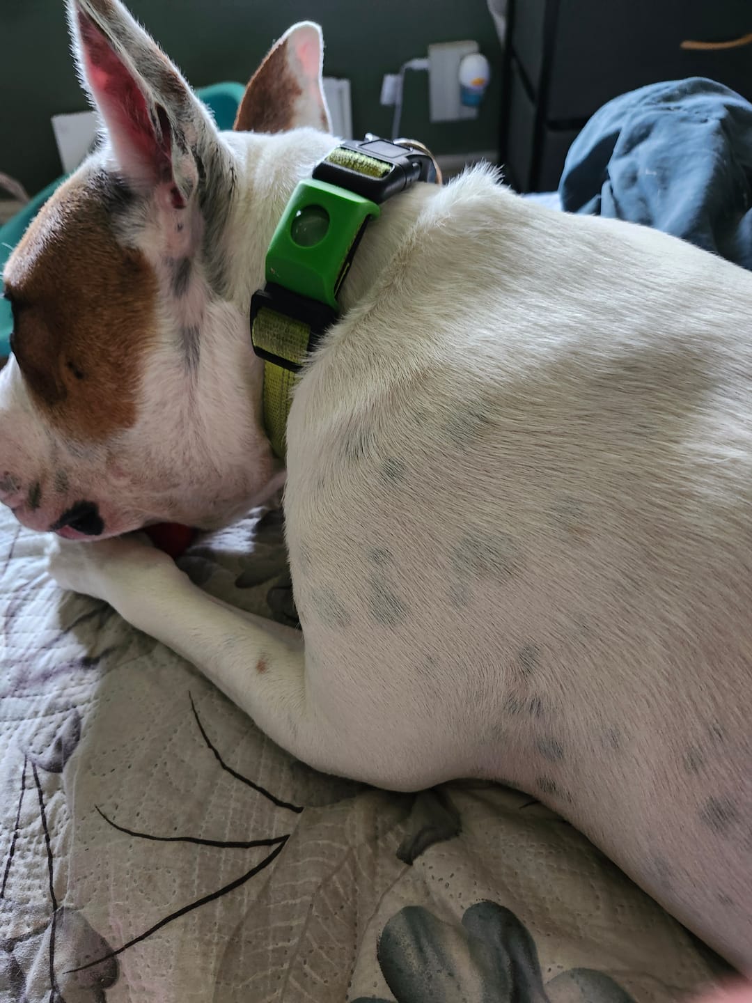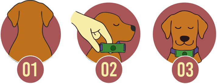 1️⃣ Plaats de halsband die de hond dagelijks draagt om de hals van de hond.