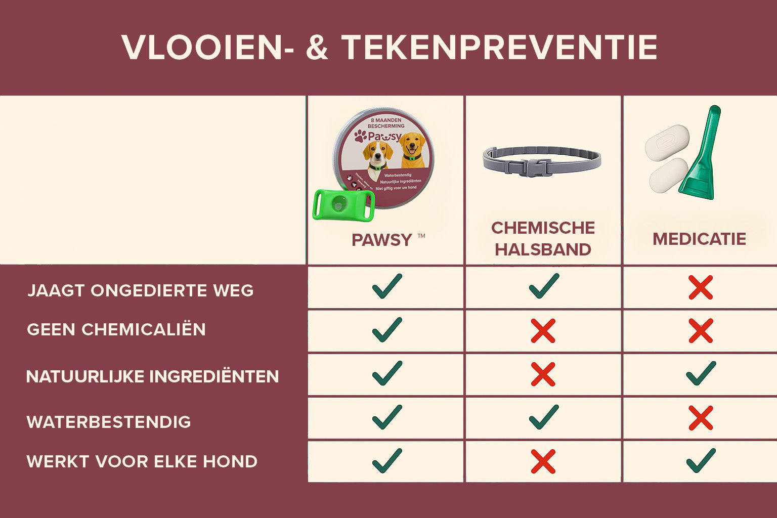 Pawsy beschermt je hond effectief tegen ongedierte – volledig zonder chemicaliën. De halsband is gebaseerd op natuurlijke ingrediënten, is waterbestendig en biedt tot wel 8 maanden betrouwbare bescherming voor elke hond.